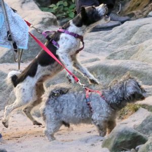 Besonders beim Erlernen der Leinenführigkeit ein Problem. Mal kommt der Hund mit seinem Leineziehen vorwärts (und belohnt sich somit selbst fürs Ziehen), mal besteht der Mensch auf lockerer Leine und Aufmerksamkeit. Das ist für Hunde nicht nachvollziehbar und ein Konzept im Kopf von „Leine = gemeinsam“ kann sich so nicht herausbilden. Hier kann es weiterhelfen, einen „Freizeitmodus“ (am Geschirr => Hund darf auch mal etwas ziehen) und einen „Arbeitsmodus“ (am Halsband => hundertprozentige Konsequenz von Seiten des Hundehalters) zu etablieren und den Arbeitsmodus zeitlich und von der Ablenkung her immer mehr auszudehnen.