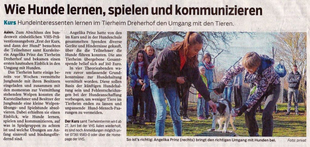 Ich plane für das Frühjahr/Frühsommer 2025 wieder einen Kurs „Erst der Kurs und dann der Hund“. Tag und Uhrzeit sind noch offen, wird mit den Interessenten abgesprochen. Der Kurs umfasst 4 Abende (1 1/2 bis 2 h) im Wochenabstand und beinhaltet zum Abschluss einen Präsenztermin im Tierheim Dreherhof, bei dem die Interessenten verschiedene Hunde kennenlernen können. Diesmal wird der Kurs als Hybridveranstaltung stattfinden, d.h. man kann live vor Ort (Aalen-Simmisweiler) oder auch via Zoom teilnehmen, es ist auch innerhalb des laufenden Kurses ein Wechsel der Variante möglich. Hier bekommen Hundeinteressenten alle Infos, die für die Entscheidung zur Anschaffung eines neuen vierbeinigen Familienmitglieds wichtig sind und umfassendes Grundwissen über Hunde, Hundehaltung und -erziehung. Der Kurs kann auch als Wissensvermittlung für den in Baden-Württemberg geplanten Hundeführerschein dienen. Ab 5 Interessenten kann der Kurs stattfinden! Kosten 50 € je teilnehmende Familie!