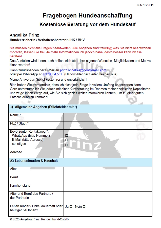 Ein Hund kann Ihr Leben bereichern – aber er verändert es auch grundlegend. Bevor Sie eine Entscheidung treffen, lohnt es sich, die wichtigsten Fragen einmal in Ruhe durchzugehen. Mein Ziel ist es, Sie dabei zu unterstützen, eine verantwortungsvolle, informierte Entscheidung zu treffen – zu Ihrem eigenen Wohl und dem Ihres zukünftigen Hundes. Mein strukturierter Fragebogen mit vielen Aha-Erlebnissen für Menschen, die verantwortungsbewusst entscheiden wollen, wird Ihnen dabei helfen, sich klar zu werden: Ob ein Hund in Ihre aktuelle Lebenssituation passt. Was mit einem Hund finanziell, emotional und zeitlich auf Sie zukommt. Welcher Hund zu Ihnen passt – und welcher eher nicht. Sowie welche Vor- und Nachteile bestimmte Anschaffungsquellen und auch Hundearten mit sich bringen.